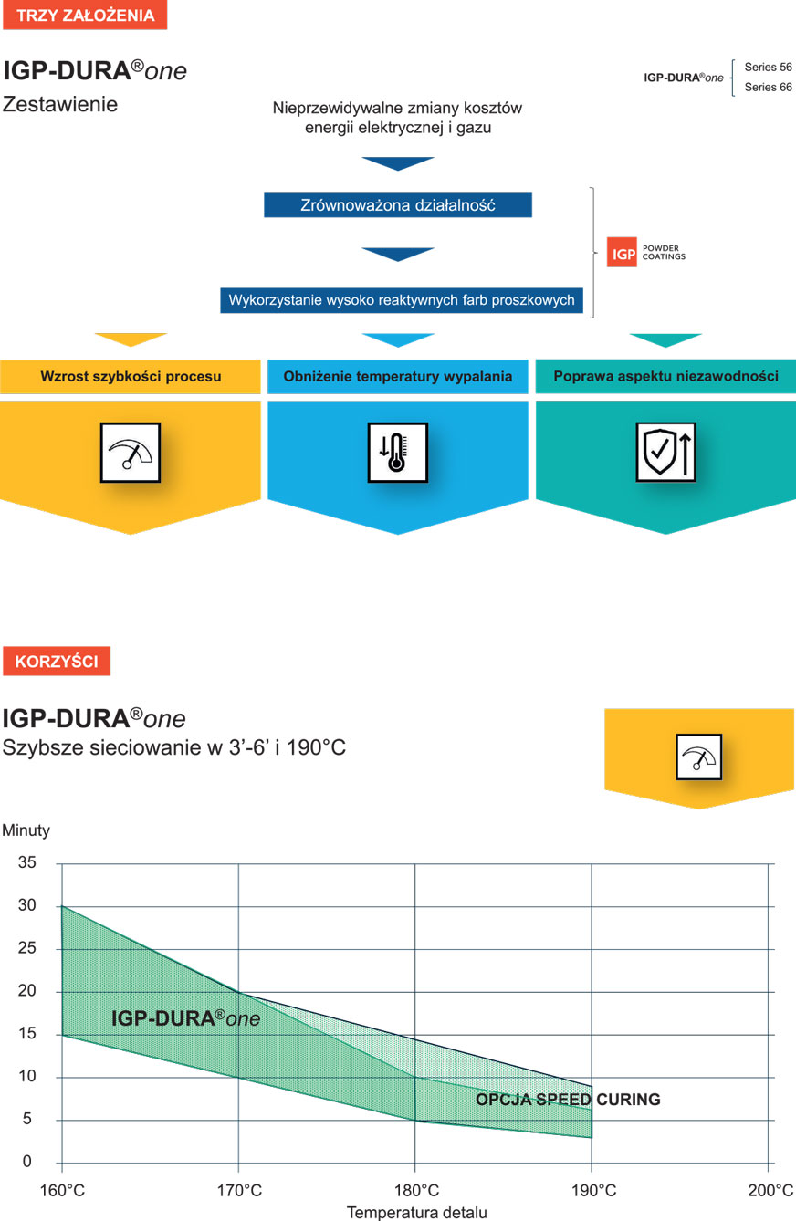 IGP-DURA®one 56 to najbardziej energooszczędna i wysocereaktywna seria farb proszkowych dostępnych na rynku. Imponuje nie tylko zakresem wypalania od niskich minimalnych temperatur utwardzania (15’, 160°C) do przyspieszających reakcję parametrów (3”, 190°C), ale także wysoką wydajnością aplikacji oraz doskonałą stabilnością utwardzania i połysku. Korzyść, która w świetle obecnych zmian cen energii elektrycznej i gazu przyczynia się znacząco do obniżenia kosztów produkcji i pozwala uzyskać trwały efekt.