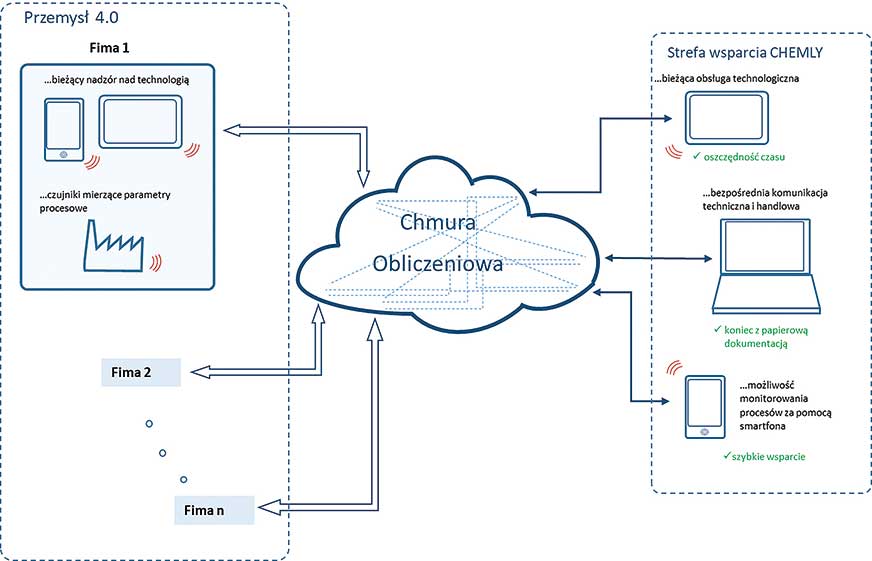 Idea Przemysłu 4.0 stawia nowe wyzwania przed dostawcami produktów chemicznych oraz doradztwem w zakresie ich stosowania. Przemysł 4.0 obejmuje cały łańcuch działań – od złożenia zamówienia do dostarczenia komponentów do bieżącej produkcji, zakłada również wsparcie załogi poprzez dostęp do praktycznie każdej przydatnej informacji w dowolnym czasie i z dowolnego miejsca. Wykorzystując możliwości innowacyjnych technologii stworzyliśmy narzędzie do inteligentnego wsparcia serwisu technologicznego i obsługi logistycznej. Rozwój Internetu oraz komunikacji bezprzewodowej pozwolił nam na opracowanie pionierskiego systemu „Chemly – chemical technology management” będącego rozbudowaną aplikacją opartą o chmurę obliczeniową. Chemly, dostępna w formie aplikacji na smartfony, tablety oraz komputery osobiste, zapewnia indywidualną współpracę on-line technologa, laboranta, kierownika produkcji w zakładzie przemysłowym z przedstawicielem handlowym, inżynierem serwisu, działem zakupów i dostaw.