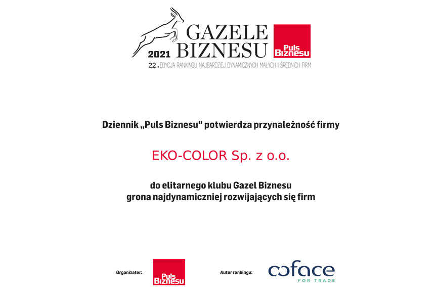 Producent farb proszkowych, firma Eko-Color po raz kolejny zdobyła tytuł Gazeli Biznesu. Edycja 2021 jest powodem do ogromnej dumy dla firmy, gdyż znalazła się w rankingu aż o 1084 pozycji wyżej w porównaniu do poprzedniej edycji!