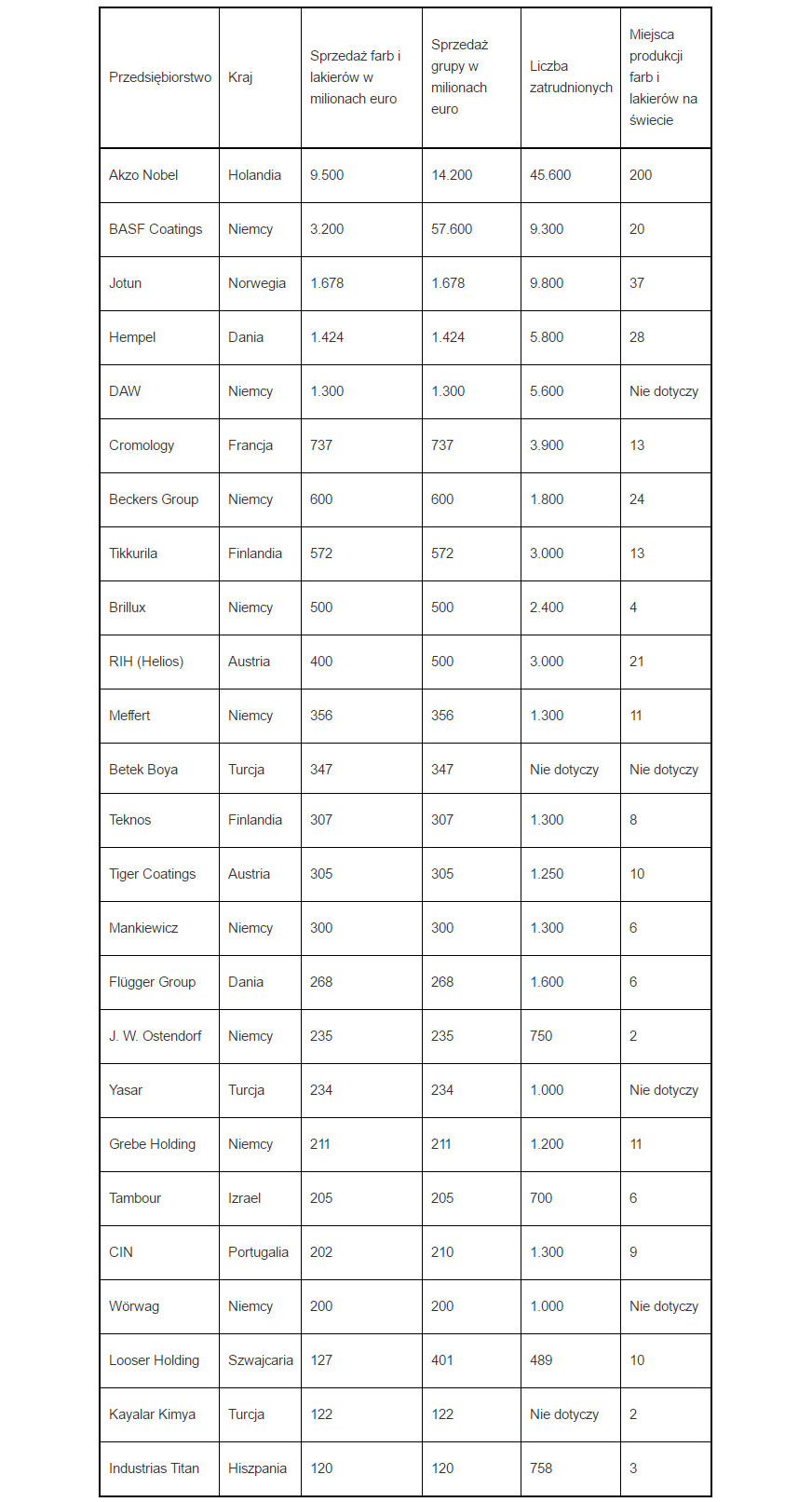 Czasopismo „Europen Coatings” ogłosiło doroczny raport 25 największych producentów farb i lakierów, które mają swoją siedzibę w Europie. Największym graczem na rynku europejskim pozostaje holenderski AkzoNobel.