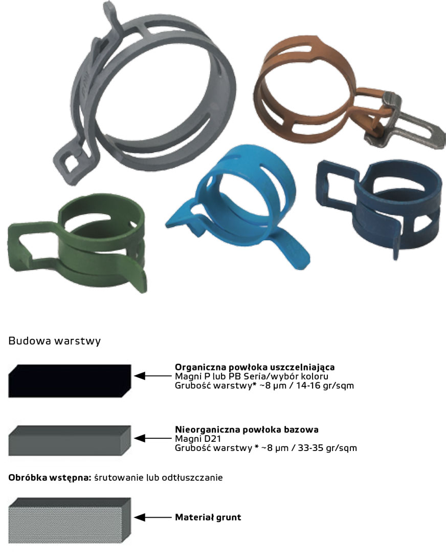 Powłoka Magni 585 łączy bogatą w cynk powłokę bazową z organiczną warstwą pokrywającą w rozmaicie dostępnych kolorach. Wysokie wymagania co do ochrony antykorozyjnej i chemiczna odporność uzupełniają się z doskonałymi właściwościami przyczepności na elementach, które muszą być do procesu montażu naciągnięte, zamocowane klipsem lub rozciągnięte. Tam, gdzie powszechnie stosowane systemy powłok natrafiają na ekstremalne warunki korozyjne, Magni 585 sprawdza się na najtrudniejszych elementach i jest skutecznie stosowana na całym świecie przez wiodących na rynku producentów części.