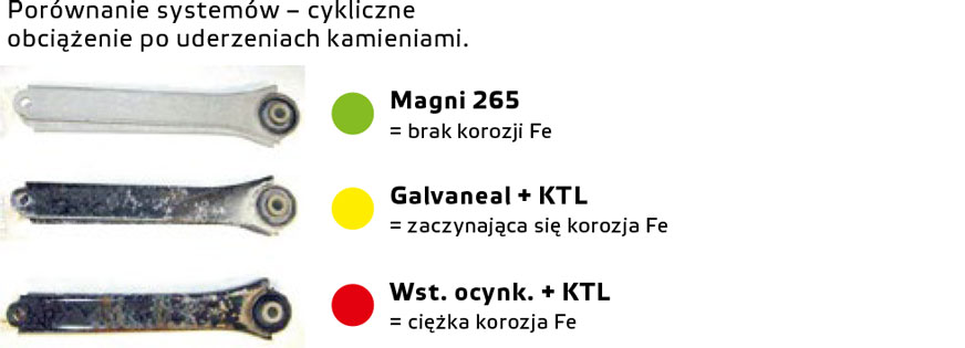Doskonała ochrona przeciwkorozyjna dla części podwozia. Ultralekkie stale o wysokiej odporności stały się nieodzowne w nowoczesnej konstrukcji. Ekonomiczność i redukcja emisji C02 odgrywają coraz ważniejszą rolę. Również całkowity bilans energetyczny w budowie pojazdu będzie w przyszłości w jeszcze w większym stopniu wpływał na kryteria wyboru materiałów. Te ważne dla bezpieczeństwa konstrukcje wymagają szczególnej ochrony przed korozją, której tradycyjne systemy nie zapewniają już w dostateczny sposób lub nie mogą być stosowane technologicznie na takich częściach. Magni 265 jest nakierowane dokładnie w tym kierunku i oferuje bardzo wysoką ochronę przed wczesną korozją materiału podstawowego, przy jednoczesnym obniżeniu ciężaru w porównaniu do na przykład cynkowania ogniowego. Magni 265 było poddane próbie pod cyklicznym obciążeniem odpowiednio do okresu użytkowania 15 lat.