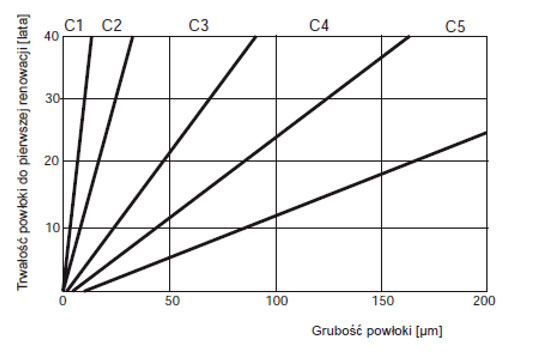 Rys. 3. Przewidywana trwałość powłoki cynkowej w zależności od warunków środowiska korozyjnego i grubości [na podstawie 4]