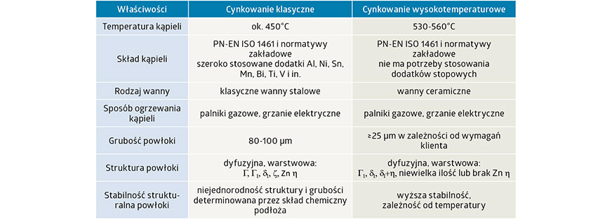 Tab. 1. Charakterystyka technologii cynkowania klasycznego oraz wysokotemperaturowego.