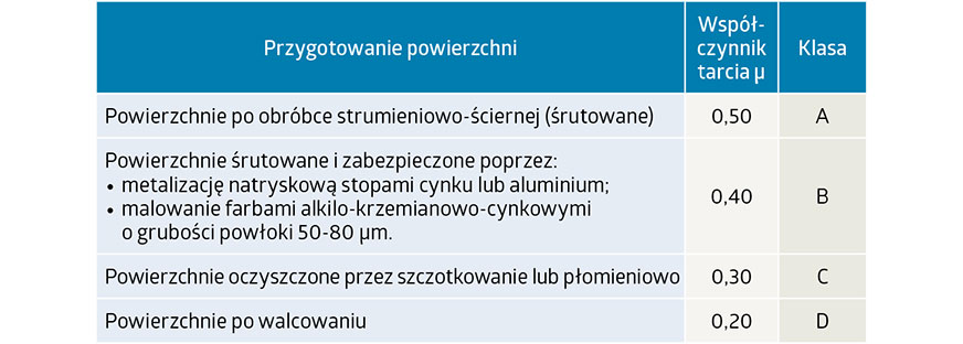 Dalej norma podaje współczynniki tarcia zależne od przygotowania powierzchni, które można przyjmować bez badań: