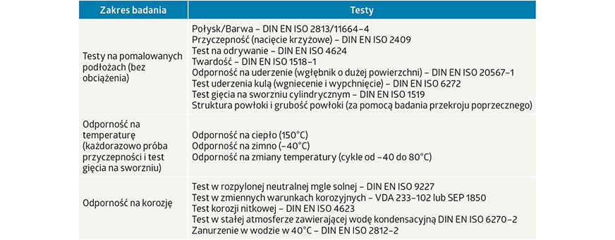 W szczególności warianty jeden i dwa wykazywały dobre wartości nawet po 3000 godzin w teście neutralnej mgły solnej, podczas gdy w trzecim wariancie bardzo wcześnie pojawiły się pęcherze. W teście korozji nitkowej powłoka konwersyjna nr 3 uzyskała również najgorsze wyniki. By zapewnić wystarczającą ochronę przed korozją, w tym przypadku elektrochemicznie osadzona warstwa anodowa wydaje się najbardziej odpowiednia. Również wśród podkładów wyłoniono na początku najbardziej obiecujących „kandydatów” do dalszych prób. Najpierw naukowcy określili właściwości w stanie nieobciążonym, takie jak siła przyczepności, odporność na zarysowania, elastyczność, kolor, wytrzymałość na zginanie, ale także odporność na działanie ciepła, zimna, zmiany temperatury, odporność na wilgoć, ochronę przed korozją i odporność chemiczną. W dalszych badaniach z trzech najlepszych podkładów stworzono kompletne powłoki, każdy z trzema farbami nawierzchniowymi. Całe kompletne powłoki zostały przetestowane zgodnie z danymi zawartymi w tabeli. Okazało się, że kombinacja powłoka konwersyjna/podkład/farba nawierzchniowa ma ogromny wpływ na wyniki. Na przykład, w przypadku testów odkształcania, w szczególności jedna z farb nawierzchniowych przyczyniała się do uszkodzenia powłoki, niezależnie od podkładu. Wydaje się, że zastosowane podłoże również ma decydujący wpływ na odporność na korozję. I tak na przykład stalowe podłoże wykazywało pęcherze w wielu testach, co mogło mieć przyczynę w zastosowanej obróbce wstępnej, a wszystkie uszczelnione podłoża aluminiowe miały problemy z przyczepnością w testach korozji. Wszystkie systemy mają wady i zalety, ale właściwości powłok są stosunkowo podobne. Po tych testach nie udało się wyłonić optymalnego systemu.