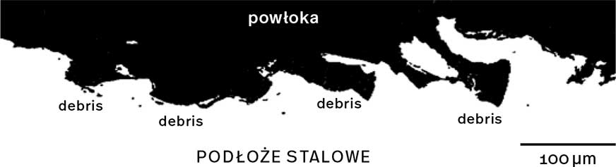 Fot. 1. Obraz SEM z polerowanego przekroju stalowego podłoża oczyszczonego metodą suchą obróbką strumieniowo-ścierną. Zwraca uwagę kumulacja szczątków (debris) żużla pomiedziowego w wyrobiskach na powierzchni (zdjęcie: Muehlhan AG, Hamburg).