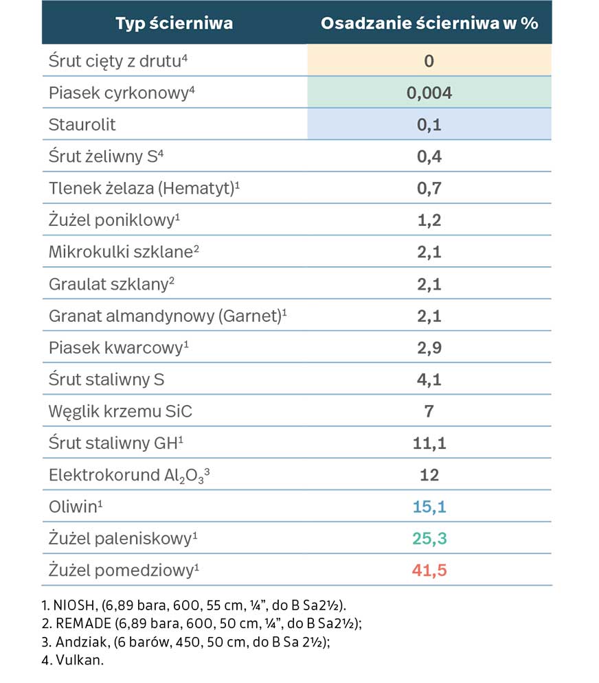 Na czerwono zaznaczono wartości najwyższe, na zielono drugie z kolei, na niebiesko trzecie z kolei. Najlepsze wartości na żółtym tle, drugie najlepsze na zielonym tle, a trzecie na tle niebieskim. Zwraca uwagę wysoki procent wbijania się w powierzchnię stali żużli odpadowych i śrutów.