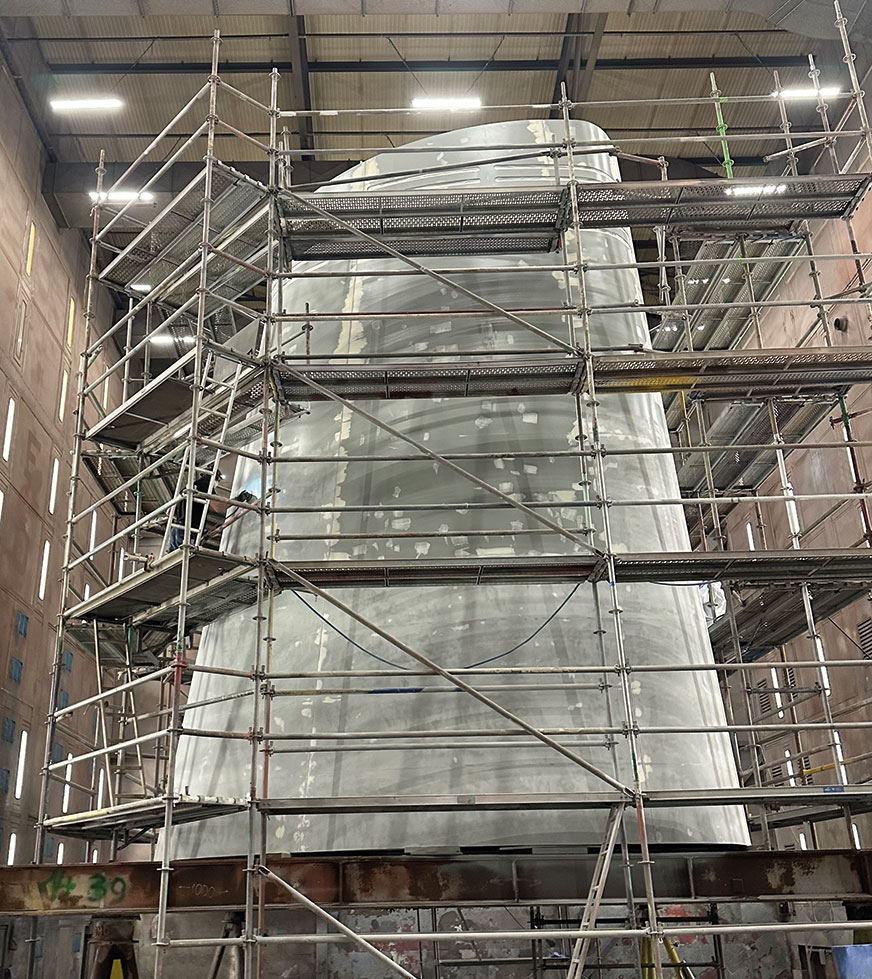 Konstrukcje stalowe wybudowane w Stoczni Szczecińskiej „Wulkan” – po lewej, po procesie śrutowania przed lakierowaniem, po prawej, po wymalowaniu