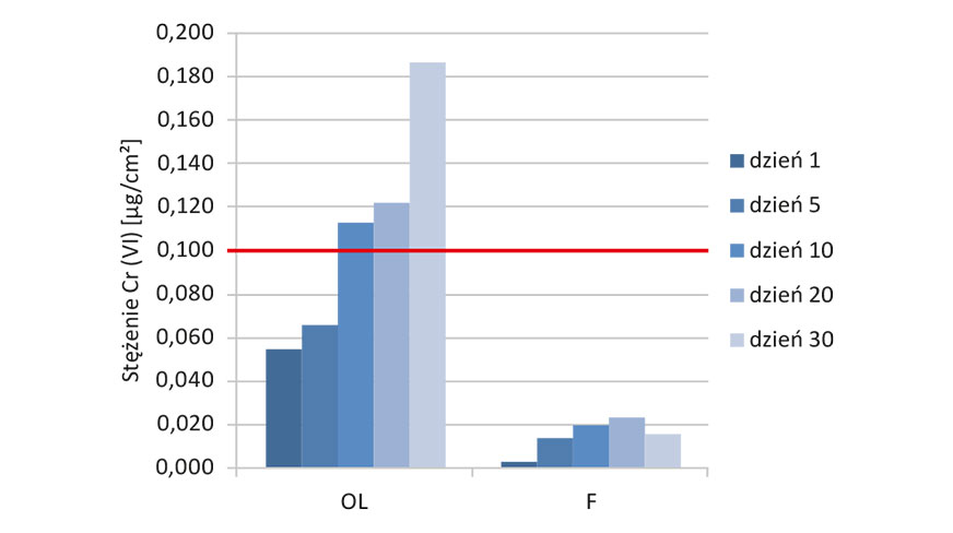 Wykres pokazuje, że stężenie chromu (VI) w próbkach wzrasta w czasie przechowywania. Zawartość chromu (VI) w powłokach uzyskanych z roztworów opartych na organicznym ligandzie wyniosła 0,055 µg/cm2 już po jednym dniu przechowywania i drastycznie wzrosła do 0,141 µg/cm² po 30 dniach. Badanie wykazało również, że rodzaj związku kompleksującego ma wpływ na tworzenie chromu (VI). W porównaniu z pasywacjami opartymi na organicznym ligandzie pasywacje oparte na fluorkach wytwarzają powłoki konwersyjne, w których powstawanie chromu (VI) przebiega wolniej. W czasie trwania badania zawartość chromu (VI) osiągnęła wartość 0,024 µg/cm², nie przekraczając dopuszczalnego limitu 0,100 µg/cm².