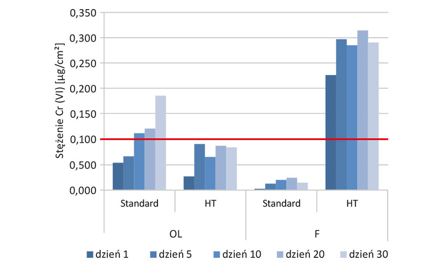 Rys. 9. Analiza chromu (VI) w powłokach konwersyjnych otrzymanych z pasywacji opartych na organicznym ligandzie (OL) lub fluorkach (F) i poddanych działaniu różnych temperatur (Standard: 60°C/10 minut; HT: 215°C/ 6h).