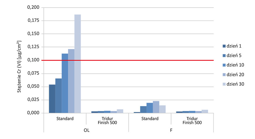 Ponieważ bezpośrednie działanie tlenu atmosferycznego na powłokę cynkową i tworzenie wodorotlenku cynku nie może zostać ograniczone, pojawia się pytanie, w jaki sposób można zahamować utlenianie chromu w powłoce konwersyjnej. W odpowiedzi na to pytanie firma Atotech opracowała dodatek stosowany w ostatniej płuczce po pasywacji: Tridur Finish 500. Rys. 10 przedstawia, w jaki sposób Tridur Finish 500 prawie całkowicie hamuje utlenianie chromu w pasywacji. W czasie trwania badania maksymalne stężenie chromu (VI) wyniosło 0,008 µg/cm² w próbkach zabezpieczonych Tridur Finish 500, podczas gdy w próbkach niezabezpieczonych stężenie chromu (VI) przekroczyło dopuszczalny limit (0,187 µg/cm² po 30 dniach). Czynnik redukujący przenika przez mikrospękania w powłoce konwersyjnej do powłoki cynkowej, redukując wytwarzanie nadtlenku. Ponadto Tridur Finish 500 nie wpływa negatywnie ani na wygląd powłoki, jak i odporność korozyjną.