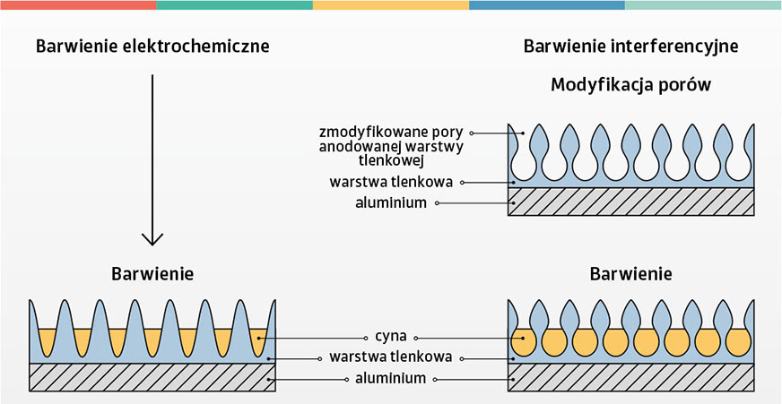 Zanim anodowane aluminium zostanie poddane ostatniej fazie procesu, czyli uszczelnianiu, warstwa tlenku glinu wykazuje charakterystyczną porowatą strukturę, która świetnie nadaje się do barwienia. Proces ten można przeprowadzić na dwa sposoby, w zależności od tego, jaki kolor chcemy nadać anodowanej powierzchni. Pierwszy – tzw. barwienie elektrochemiczne – polega na zanurzeniu detalu w elektrolicie zawierającym jony soli cyny. Metal osadza się na dnie porów i zabarwia powierzchnię aluminium na różne odcienie – od jasnego brązu po czerń (zależnie od czasu zanurzenia przy stałej wartości prądu). Z kolei w procesie barwienia interferencyjnego przed poddaniem detalu oddziaływaniu soli cyny przeprowadza się dodatkowo modyfikację struktury dolnej części porów, nadając im kształt sferyczny. Dzięki temu można poszerzyć zakres wariantów kolorystycznych powłoki o odcienie szarości i zieleni. Nazwa tego procesu pochodzi od zjawiska interferencji, tj. nakładania się na siebie fal światła odbitego (w tym przypadku przez zmianę kształtu porów), które powoduje zmianę amplitudy fali wypadkowej decydującej o ostatecznym efekcie optycznym (kolorze).