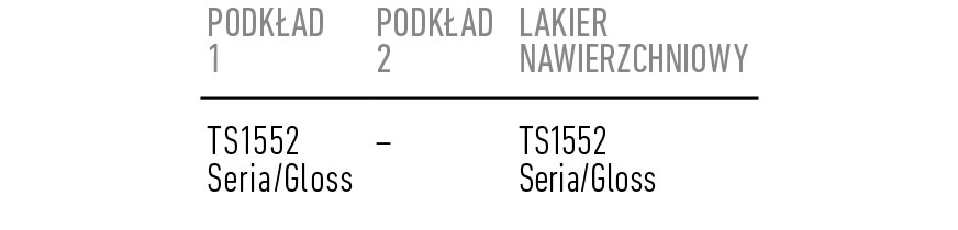 - dwie warstwy bezbarwnego, wielowarstwowego rozcieńczalnikowego lakieru TS1552 Seria/Gloss utwardzonego 10% utwardzaczem TX90