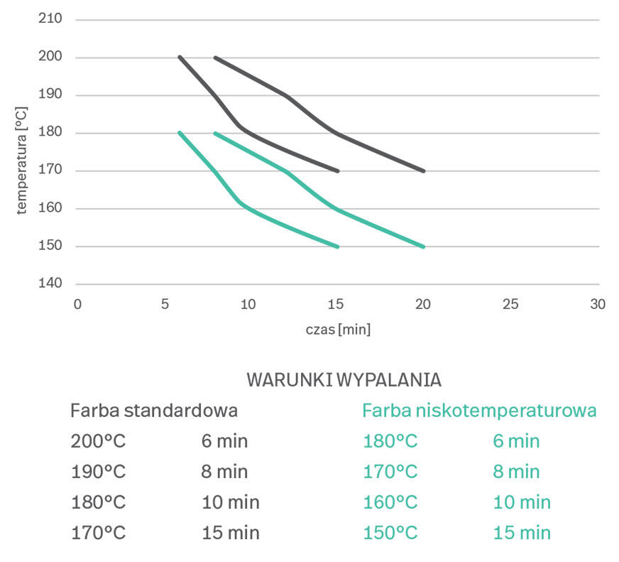Wykres przedstawia porównanie parametrów wygrzewania farby standardowej i niskotemperaturowej (z ich minimum i maksimum temperaturowym oraz czasowym). W przypadku farb niskotemperaturowych można podnieść temperaturę i skrócić czas wygrzewania (np. 180°C/6 min), co zwiększa możliwości produkcyjne