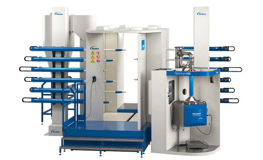 Zaawansowana technologia systemów natryskowych zapewnia najwyższą wydajność przy najniższych kosztach operacyjnych. Dzięki systemowi DCM i delikatnemu natryskowi technologii Nordson Dense Phase Technology zwiększamy automatyczne pokrycie i uzyskujemy najwyższą kontrolę procesu w aplikacji malowania proszkowego.