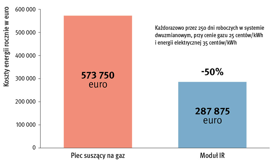 Dla porównania, utwardzanie farby proszkowej Teknos w technologii IR wymaga tylko 235 kW/h energii elektrycznej. Ponadto energię można zaoszczędzić, jeśli uwzględni się rzeczywisty czas pracy. Podczas gdy piec suszący, w tym podgrzewanie, stale zużywa energię, promienniki IR przełączają się w tryb czuwania w czasie zmiany roboczej i zmiany koloru, a także na czas czyszczenia i przerwy. Przy przejściu na technologię IR realne są czasy amortyzacji wynoszące 1−2 lata, w zależności od konkretnych wymagań i cen zakupu energii.