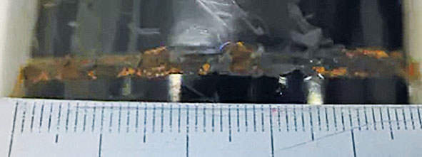 Element pokryty farbą proszkową z dodatkiem nanocząstek węglowych − 80% mniej korozji. Zmiany korozyjne podłoża metalicznego o szerokości około 2 mm, powstałe w wyniku testu korozyjnego na komponencie pokrytym farbą proszkową z dodatkiem nanocząstek węglowych. Uzyskano redukcję zmian korozyjnych o 80% w porównaniu ze zwykłą farbą proszkową