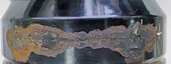 Zmiany korozyjne podłoża metalicznego o szerokości około 10 mm, powstałe w wyniku testu korozyjnego na komponencie pokrytym konwencjonalną farbą proszkową