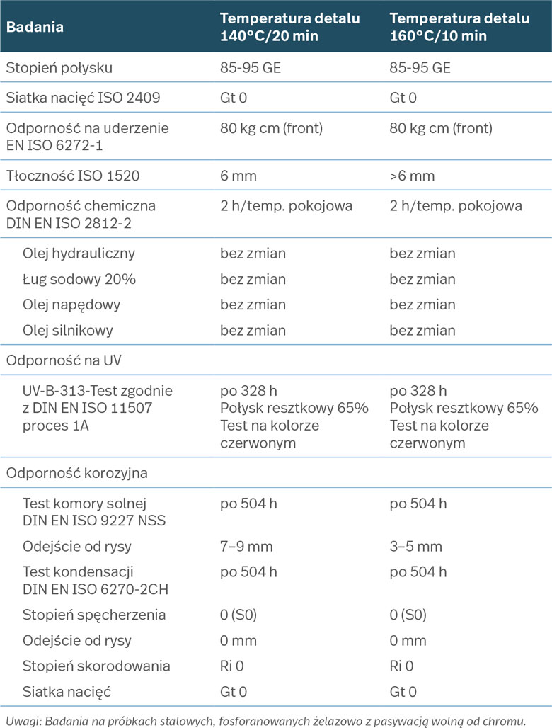 Tabela 1. Właściwości powłoki z energooszczędnej farby poliestrowej, wygrzewanej w 140°C i 160°C.