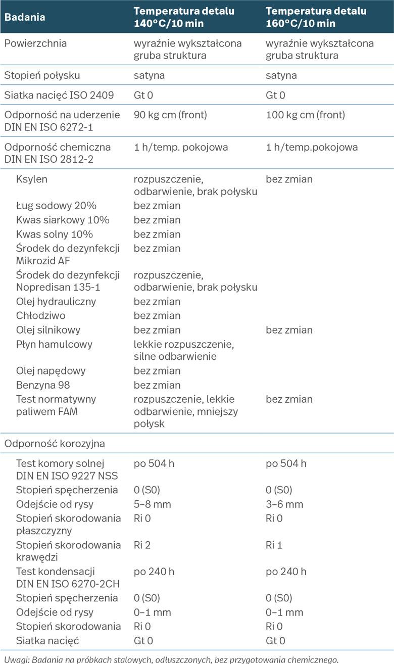Specjalnie do zastosowań i wymagań w branży budowy maszyn stworzono farbę proszkową o typowej powierzchni grubej struktury, o różnej charakterystyce w zakresie stopnia połysku − półpołysk, która utwardza się od 10 min przy temp. 140°C (rys. 2, zdjęcie 2, tabela 3 i 4). W połączeniu z optycznie dostosowanym systemem farb mokrych o wysokiej zawartości części stałych (High Solid) lub farb wodorozcieńczalnych tworzą one farby systemowe we FreiLacke.