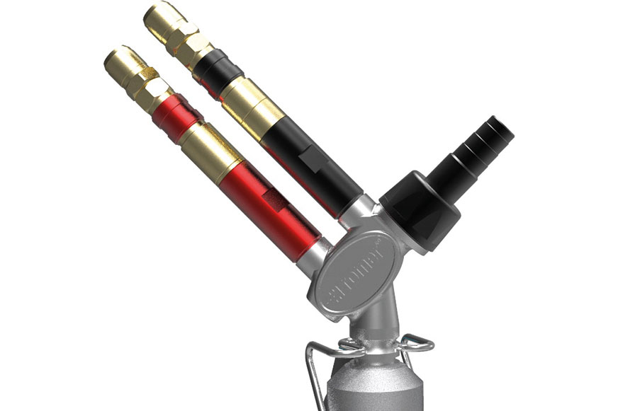 Nowa wydajna konstrukcja inżektora pozwala zaoszczędzić farbę i powietrze w porównaniu z inżektorami pod kątem prostym