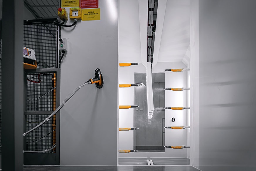 Nowoczesne linie lakiernicze to nie tylko oszczędność energii, ale także kompleksowa optymalizacja przepływu materiałów i mediów. Kabiny lakiernicze Ecoline, dzięki zoptymalizowanej aerodynamice, zapewniają równomierne rozprowadzenie proszku przy minimalnych stratach materiałowych. Zintegrowane systemy odzysku pozwalają na ponowne wykorzystanie proszku, a automatyzacja ruchów natryskowych zwiększa powtarzalność procesu i eliminuje błędy ludzkie. Ważnym elementem jest tutaj również, często niedoceniana, hermetyzacja procesu. Oddzielenie strefy malowania od czynników zewnętrznych stabilizuje parametry środowiskowe, takie jak temperatura, wilgotność czy przepływ powietrza. Dzięki temu ryzyko powstawania niedomalowań i zanieczyszczeń zostaje ograniczone do minimum, a jakość powłok utrzymuje się na niezmiennie wysokim poziomie. Systemy monitoringu umożliwiają przy tym bieżące rejestrowanie parametrów i natychmiastową reakcję w przypadku odchyleń, co gwarantuje pełną zgodność z wymaganiami jakościowymi odbiorców.