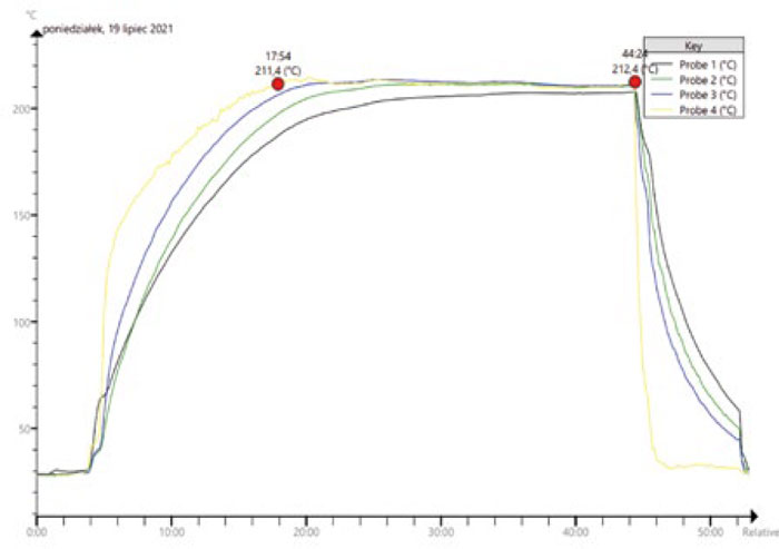 Temperatura wypalania farby proszkowej zależy od użytych komponentów. Informacja ta zawarta jest na opakowaniu, w którym dystrybuowana jest farba oraz karcie technicznej produktu. Temperatura oraz czas przebywania elementu w piecu są niezwykle ważne, ponieważ dzięki dostarczonej energii zachodzi reakcja polimeryzacji pomiędzy żywicą a utwardzaczem, czasem pomiędzy dwoma żywicami użytymi w produkcie i stanowi o tym, czy powłoka zdobędzie swoje właściwości. Należy pamiętać, że czas określony przez producenta to czas liczony od momentu osiągnięcia danej temperatury przez cały element, który jest pokryty farbą proszkową. W celu sprawdzenia poprawności tego procesu wykorzystuje się termograf. Wykres 3 prezentuje wydruk z takiego właśnie urządzenia. Nastawy na piecu 210°C. Widzimy na wykresie cztery linie. Kolejno: żółtą – czujnik mierzący temperaturę powietrza, niebieską – czujnik mierzący górną część detalu, zieloną – czujnik mierzący środek detalu i czarną – czujnik mierzący dół detalu. Na wykresie można zauważyć, że powietrze uzyskuje najszybciej zadaną temperaturę w 17:54 minucie, wynosi ona 211,4°C. W tym samym czasie dół elementu osiąga dopiero 180°C. Bardzo ważne zatem jest, aby badać temperaturę detalu, a nie powietrza, szczególnie jeśli malujemy duże stalowe komponenty.