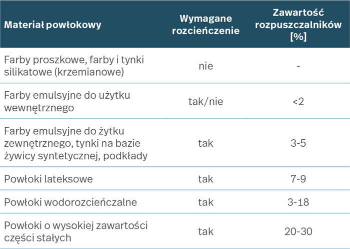 Tabela 1. Podział materiałów powłokowych ze względu na konieczność rozcieńczenia