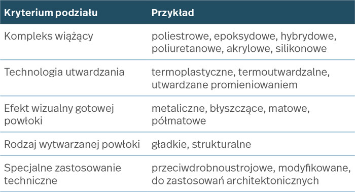 Tabela 2. Przykładowe kryteria podziału farb proszkowych