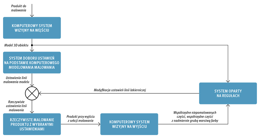 Strukturę proponowanego systemu przedstawia rys. 1. Zanim rozpocznie się proces malowania, model 3D wyrobu jest wykorzystywany w systemie symulacji komputerowej do wyboru najbardziej odpowiednich parametrów aplikacji. Na podstawie parametrów kontrolnych i rezultatów symulacji dobierana jest taka konfiguracja ustawień, która spełnia wymagania dotyczące minimalnych powierzchni niepomalowanych lub nadmiernie pomalowanych oraz zapewnia najniższy przepływ farby do rekuperatora. Mimo że czas symulacji jest znaczący ze względu na dużą złożoność obliczeniową i konieczność iteracji wielu wariantów, proces ten może toczyć się równolegle z malowaniem poprzedniej partii, tak by nie powodować przestoju. Ustalony zestaw parametrów wykorzystywany jest następnie do ustawienia linii lakierniczej. Po zakończeniu procesu malowania pomalowany produkt jest poddawany dokumentacji fotograficznej, a komputerowy system wizyjny dokonuje oceny powierzchni – bada obszary, które mogłyby zostać niedostatecznie pokryte kolorem. Gdy liczba defektów przekroczy poziom akceptowalny, system rekomendacji generuje odpowiednie sugestie dotyczące korekty ustawień.