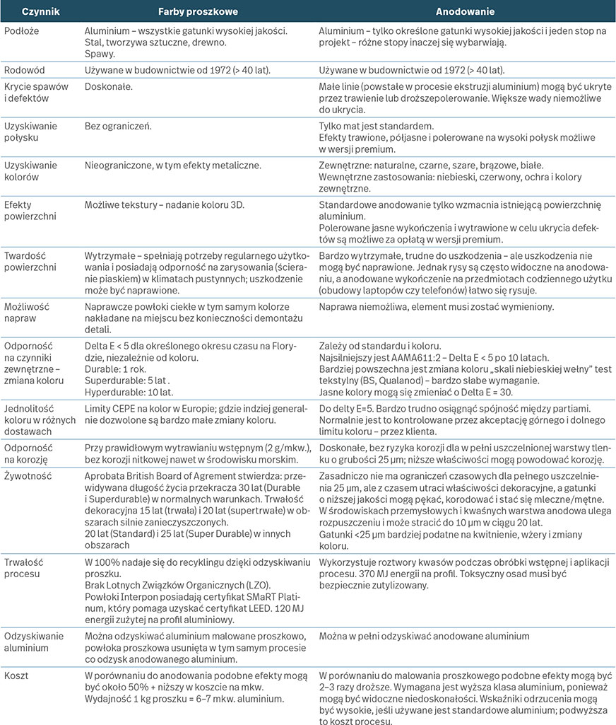 Anodowanie jest atrakcyjną wersją odmieniania aluminium. Pokazuje żywe piękno metalu. Niestety, osiąganie wysokich parametrów odpornościowych i jednostajnej wysokiej jakości jest problematyczne. Oba procesy: lakierowanie i anodowanie nadają piękny wygląd przy zachowaniu parametrów technicznych, ale to farby proszkowe zyskały przewagę, dając przy tym niemal taki sam wygląd jak anodowanie (porównaj tabela nr 5). Wiele zależy od jakości wykonania, jakościowo niskie anodowanie (poniżej 18 µm) jest sporo tańsze od lakierowania – ale wyłącznie krótkoterminowo. Naprawy i wymiany elementów szybko i znacznie podrożą całkowity koszt. Lakierowanie proszkowe nie dość, że generuje o wiele mniej problemów dla wykonawców, to można je w łatwy sposób naprawiać, kolory z różnych partii aluminium się nie różnią niemalże, można powlekać różne podłoża, co zapewnia harmonijność projektu. Między innymi z tych powodów oferta anodowania kurczy się w ostatnich latach, zastępowanie anodowania lakierowaniem proszkowym (w tym kolekcją ANODIC) jest procesem naturalnym ze względu na swoje zalety. Podobne zalety ma lakierowanie proszkowe efektami z kolekcji specjalnych imitujących naturalne rozwiązania. Naśladowanie natury, by dać jej złapać oddech, nie ma w sobie nic wstydliwego.