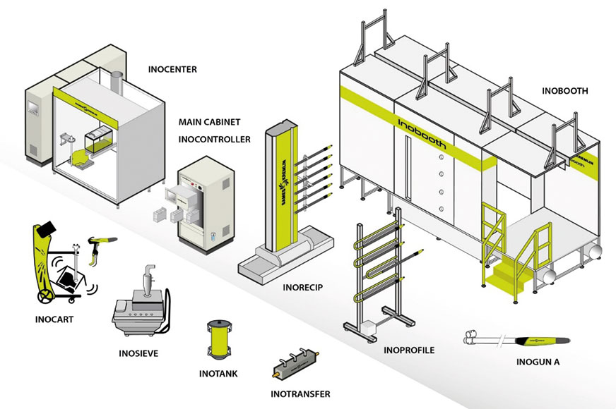 Inocoat to kompletna gama proszkowa. W wersji automatycznej obejmuje kabinę, kuchnię proszkową, manipulatory, moduł sterowania i oczywiście pistolety natryskowe.