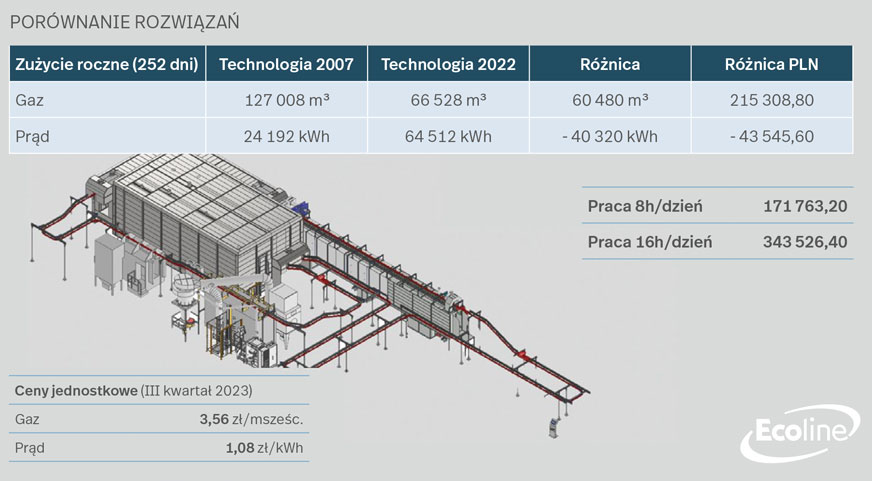 Przy założeniu pracy linii 252 dni roboczych w roku, 8 godzin dziennie, generujemy koszty roczne gazu w przypadku nowej linii 60 000 m3 oszczędności, w przypadku prądu zużywamy go więcej o 40 000 kW. Oszczędności z tytułu gazu to 215 000 zł, natomiast za prąd w stosunku do starej linii wydajemy o 43 000 zł więcej.