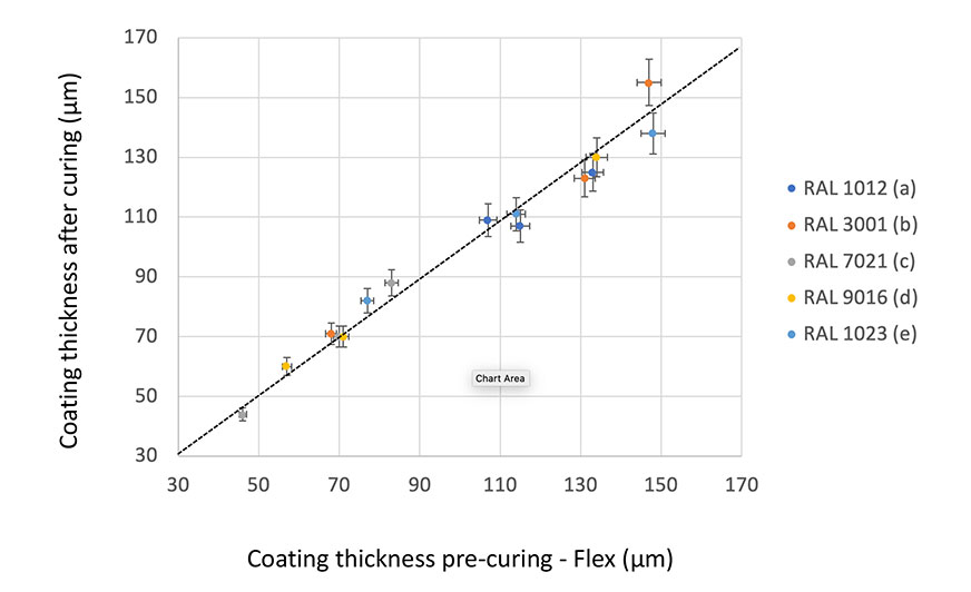 Powtarzalność urządzenia coatmaster Flex wynosi średnio 2,1 proc. wyświetlanej wartości pomiarowej we wszystkich pozycjach pomiarowych i 3,5 proc. w odniesieniu do metody kontaktowej. Grubości warstw przed wypaleniem wykazują wysoką zgodność z grubościami warstw po wypaleniu, niezależnie od koloru RAL. W większości przypadków odchylenie wynosi tylko kilka μm. W zakresie powtarzalności pomiar przed utwardzeniem jest zgodny z pomiarem po utwardzeniu.