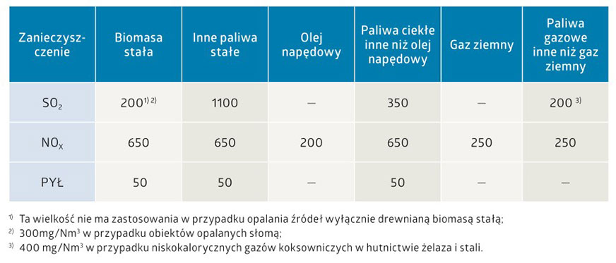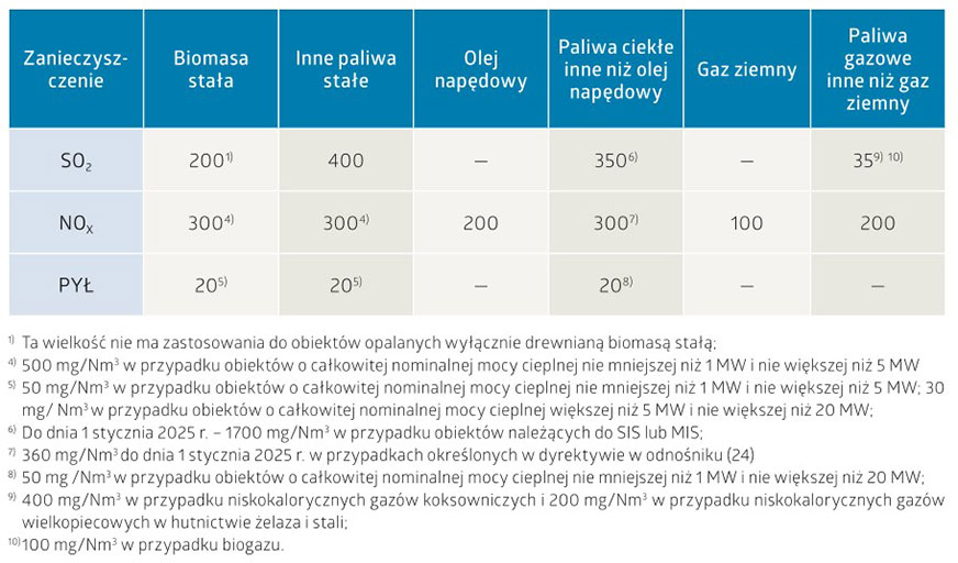 Dla istniejących średnich obiektów energetycznego spalania o nominalnej mocy cieplnej większej niż 5 MW, innych niż silniki i turbiny gazowe, w przypadku SO2 i pyłu, dopuszczalne wartości emisji, szczególnie dla paliw stałych, są znacznie niższe od ww. wartości wymienionych w tabeli 1.