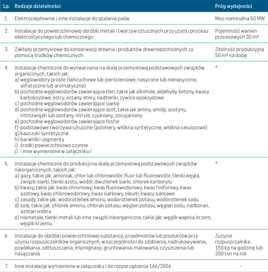 Otóż zgodnie z art. 236b ww. ustawy prowadzący instalację obejmującą co najmniej jeden z rodzajów działalności określonych w załączniku I do rozporządzenia 166/2006, który prowadzi tę instalację z przekroczeniem progów wydajności określonych w tym załączniku, przekazuje wojewódzkiemu inspektorowi ochrony środowiska: