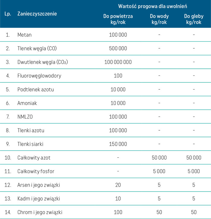 W tabeli 2 podaję wybrane rodzaje zanieczyszczeń i odpowiednie dla nich wartości progowe dla uwolnień.