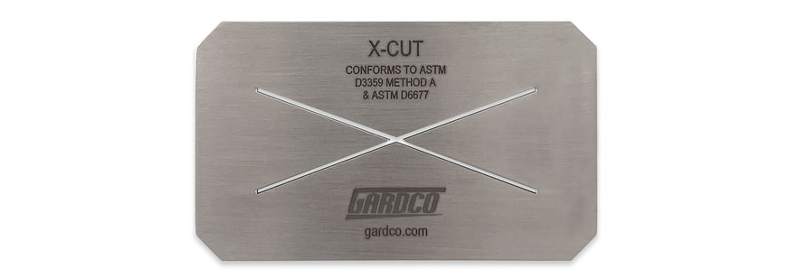 Korzystając z szablonu i noża Gardco X-Cut, użytkownicy mogą wykonać kilka blisko siebie rozmieszczonych nacięć X przez powłokę do podłoża. Wykonywane są dwa cięcia, które przecinają się pod kątem 90 stopni, aby uzyskać wzór siatki pod kątem prostym. Następnie można zastosować kontrolowany nacisk za pomocą taśmy, aby ocenić, czy właściwości adhezyjne powłoki do podłoża są prawidłowe.