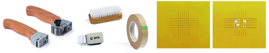 Można wyposażyć się w zestaw dedykowany, wykonujący tylko ten test, lub przyrząd uniwersalny, gdzie test Buchholza jest jednym z kilku. Dobry przykład takiego rozwiązania to byko-cut Universal – przyrząd spełniający cztery użyteczne funkcje. W wersji najprostszej to mikroskop o powiększeniu 50X z oświetleniem LED i podziałkami do wymiarowania. Na rewolwerze przyrządu możemy zainstalować dodatkowo: noże do testu siatką nacięć (cross-cut), noże do zniszczeniowego pomiaru grubości powłoki oraz akcesoria twardościomierza metodą Buchholza (zgodnie z DIN EN ISO 2815). Metoda alternatywna to test ołówkowy według Wolfa-Wilburna, możemy tu jednak napotkać trudności z utrzymaniem powtarzalności twardości grafitów przez producentów ołówków, nawet tych renomowanych. Wady tej nie ma Dur-O-Test: elementem roboczym jest tu trzpień stalowy, a jego napór na powłokę wyznacza skalowana sprężyna. Ta ostatnia cecha, w przeciwieństwie do testów wg Buchholza i testera ołówkowego, gdzie główną rolę gra grawitacja, umożliwia testowanie na płaszczyznach skośnych, pionowych lub sufitach. Laboratoria często sięgają po metodę wahadła według Koeniga-Persoza, uwzględniającą własności elastyczne powłoki.