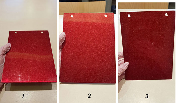 Aby lepiej uzmysłowić czemu powinniśmy stosować się do powyższych zaleceń posłużymy się przykładem. Posiadamy dwie płytki pomalowane dwoma rodzajami lakieru: lakier jednorodny i lakier z efektem metalicznym. Obracając w ręku płytkę pokrytą lakierem jednorodnym nie obserwujemy zmian barwy, natomiast unosząc i przechylając próbkę pokrytą lakierem metalicznym widzimy jak jej barwa i jasność ulega zmianie (fot. nr 1).