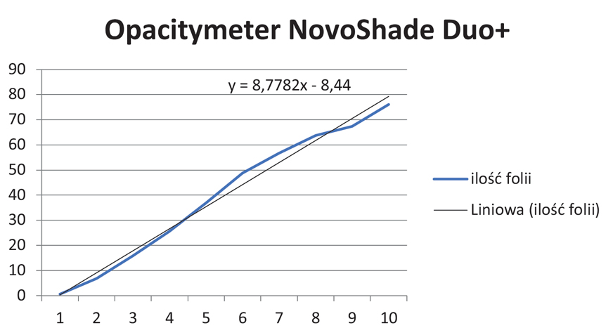W kolejnych akapitach zobrazujemy wyniki siły krycia wykonane różnymi przyrządami. W celu wygodnego przeprowadzenia pomiaru siły krycia dla różnych grubości warstwy wykorzystano półprzepuszczalne folie o grubości ok. 200 μm każda. Siła krycia każdej z pojedynczych folii była podobna, a nałożone na siebie zwiększały grubość testowej powłoki. Kontrastowym podłożem była czarno-biała karta testowa TQC o zwiększonym kontraście optycznym.