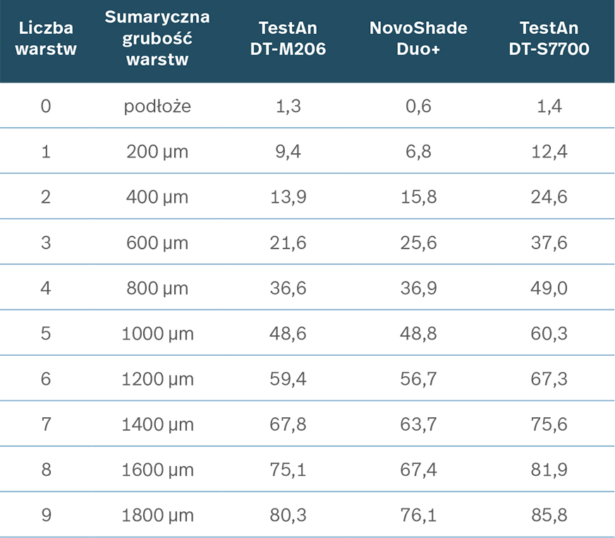Tabela prezentuje zmiany wartości siły krycia wraz ze wzrostem grubości powłoki na kontrastowym, biało-czarnym podłożu. Wartość 0 oznacza całkowitą przezroczystość (brak krycia podłoża), a wartość 100 to pełne krycie, bez wizualnego oddziaływania podłoża.
