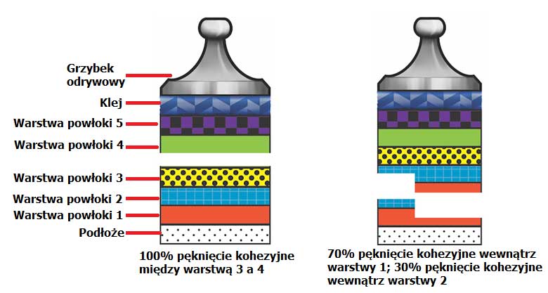 Po zakończeniu próby odrywania należy zbadać grzybek odrywowy i powierzchnię powłoki. Oprócz siły zrywającej wiele norm krajowych i międzynarodowych, takich jak ASTM D4541 i ISO 4624, wymaga zapisania charakteru pęknięcia.