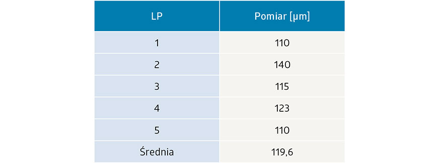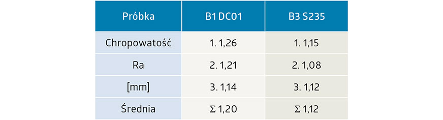 - w trzech próbkach z blachy o grubości 3 mm na promieniu gięcia 10 mm (1 – przy braku odtłuszczenia, 2 – preparat na bazie wody, 3 – rozpuszczalnik uniwersalny) – doszło do znacznego braku przyczepności pomiędzy warstwą tlenków a blachą; w pozostałych widoczne były niewielkie pęknięcia,