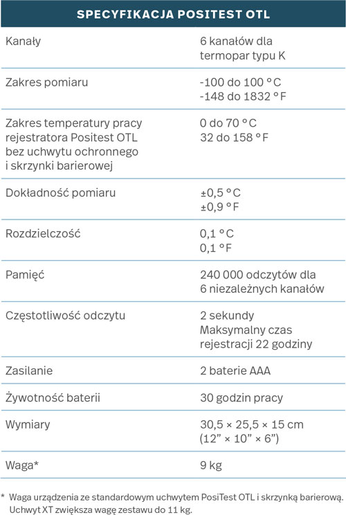 Przykładem takiego miernika jest nowa propozycja producenta DeFelsko, PosiTest OTL. Urządzenie mierzy i rejestruje do 40 000 zestawów danych (240 000 odczytów) dla sześciu niezależnych kanałów. W skład zestawu wchodzi wysokotemperaturowa skrzynka barierowa ze stali nierdzewnej z izolacją z włókna szklanego zapewniająca długi czas pracy w wysokich temperaturach. Posiada sześć portów dla termopar typu K (dostępna jest szeroka gama sond z czujnikami w oplocie ze stali nierdzewnej), a w postaci dołączanego oprogramowania PosiSoft otrzymujemy intuicyjne narzędzie do analizy i obróbki danych czy eksportowania do arkusza kalkulacyjnego. PosiTest OTL jest dostępny w dwóch konfiguracjach. PosiTest OTL XT posiada ulepszony uchwyt z radiatorem dla większej wytrzymałości w wysokich temperaturach.