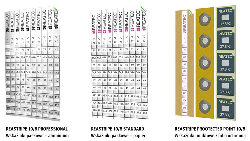 Paskowe wskaźniki temperatury szwajcarskiej firmy REATEC® są istotną alternatywą lub uzupełnieniem dla standardowych termometrów. Mogą być z powodzeniem stosowane przy minimalnym nakładzie pracy i przy niskich kosztach, wszędzie tam, gdzie inne termometry są zbyt duże, mało mobilne, wrażliwe na wibracje, szok termiczny, zbyt rozbudowane lub po prostu za drogie.