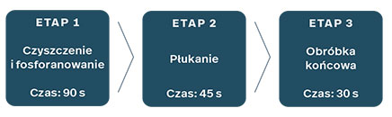 Pierwszy etap jest wielozadaniowy, następuje w nim dokładne usunięcie wszystkich zanieczyszczeń, a następnie nałożenie powłoki fosforanowej. Etap drugi to płukanie mające na celu spłukanie nieprzylegających zanieczyszczeń i zatrzymanie reakcji fosforanowej na powierzchni. Etap trzeci to płukanie chemiczne przed suszeniem, które ma na celu usunięcie śladowych pozostałości chemicznych, zapobieganie rdzy powierzchniowej i poprawę ogólnej wydajności produktu.