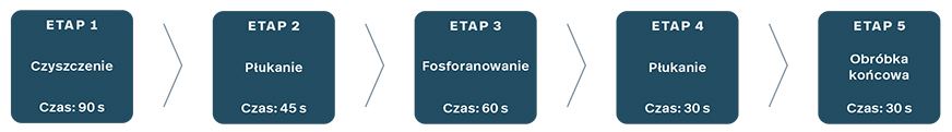 W pierwszym etapie stosowane są alkaliczne środki czyszczące, które są znacznie lepsze w usuwaniu zanieczyszczeń z powierzchni podłoża w porównaniu do chemikaliów czyszcząco-powlekających. Celem etapu drugiego jest neutralizacja zasadowości, spłukanie wszystkich pozostałości zanieczyszczeń i przygotowanie części do równomiernego tworzenia się fosforanu. W etapie trzecim następuje powstanie jednolitej, zwartej i amorficznej powłoki fosforanu żelaza. Celem etapu czwartego jest spłukanie pozostałości roztworu fosforanowego, zatrzymanie dalszej reakcji fosforanowania i oczyszczenie części do końcowego płukania. Celem końcowego płukania w etapie piątym, niezależnie od tego, czy jest to ostatni etap w systemie trójstopniowym czy pięciostopniowym, jest zapobieganie szybkiemu rdzewieniu powierzchni oraz zwiększenie odporności na korozję.