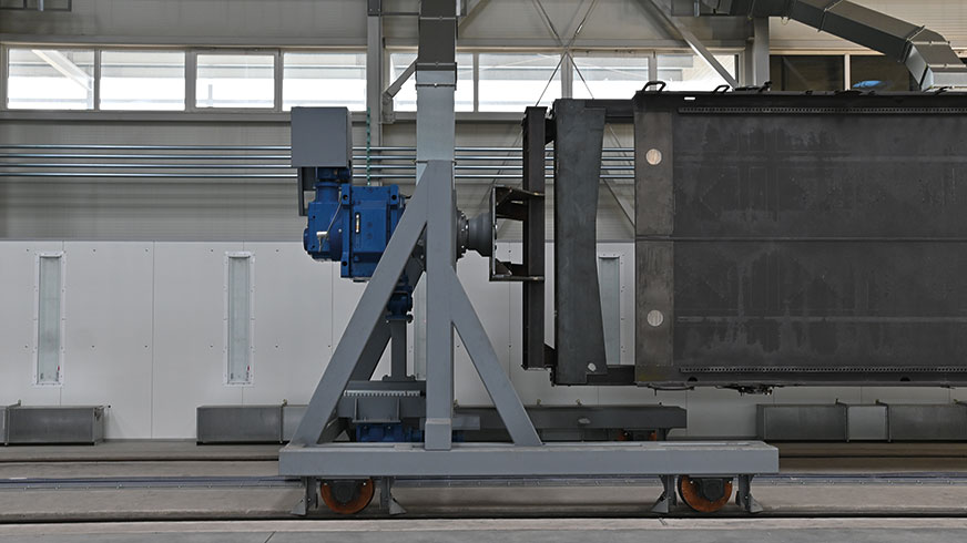 Cała linia śrutowania i lakierowania wyposażona jest w trzy zestawy wozów transportowych: